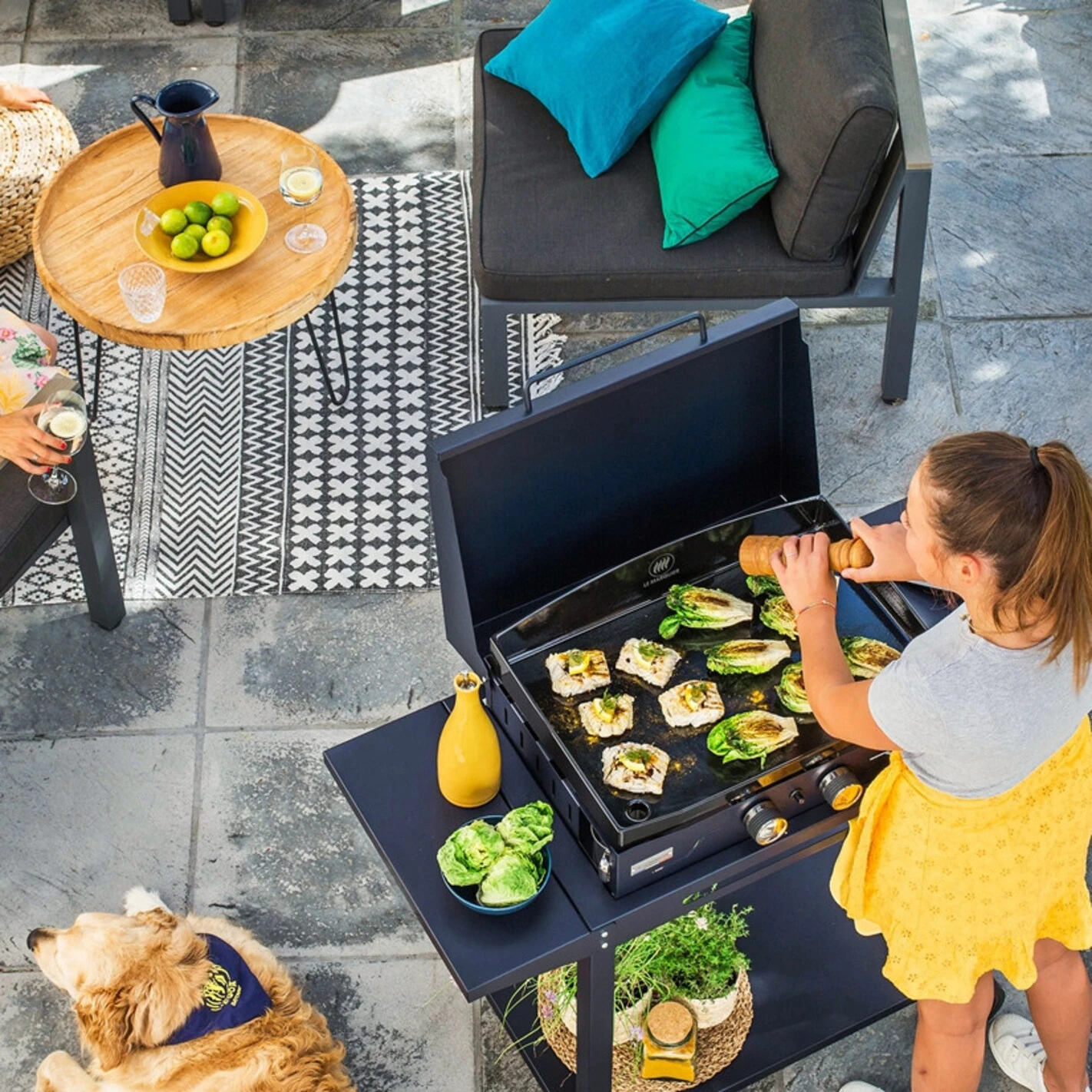 Contrairement à un couvercle de barbecue, le capot d’une plancha doit toujours resté ouvert quand vous cuisinez. Il se ferme une fois les brûleurs éteints pour maintenir au chaud les aliments ou avant d’installer la housse de protection.